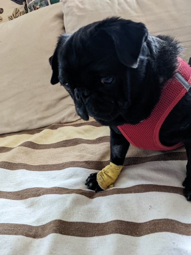 Der vorhandene Mops kam leider nicht mit ihm zurecht. Na ja, ich glaube ja an Karma, und so nahm ich ihn auf. Klein Alberich kommt aus schlimmen Verhältnissen ( möchte ich nicht erklären, denn es bricht mir mein Herz) und hat körperliche Defizite. Seine Motorik in den Beinen ist gestört so das er sich seine Pfötchen blutig läuft. Zudem ist sein Gangbild gestört. Er läuft hinten sehr unsicher und wankt häufig. Neurologische Störungen sind nicht von der Hand zu weisen. Ich habe gestern mit der Physiotherapie begonnen und beginne damit die Rückenmuskulatur und die Beinmuskulatur etwas aufzubauen. Schwimmen waren wir auch schon, was Alberich aber total doof findet Nächste Woche, wenn er sich ein wenig eingelebt hat und es nicht mehr so heiß ist, wird er meiner Tierärztin vorgestellt. Es wird dann alles abgeklärt um dem kleinen Mann adäquat helfen zu können.